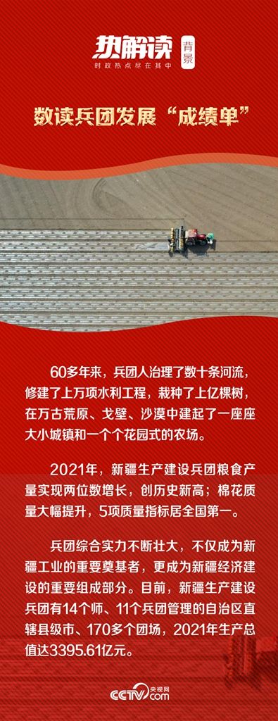 经过几代人的艰苦奋斗,兵团人创造了令人刮目相看的发展奇迹。据统计,新疆每3亩耕地中就有1亩是兵团开垦的,新疆粮食产量的19.9%、油料产量的30%、甜菜产量的44.5%来自于兵团。