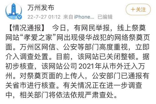 公告表示,2021年网站由市外迁入万州,成立重庆孝爱之家网络科技公司,在重庆万州、渝北运维。重庆孝爱之家网络科技公司参与后,不规范,不敏感,也未审核发现存在的问题。侵华日军罪行累累,罄竹难书,历史不容背叛。由于我们的疏忽,严重伤害了民族感情,我们深感痛心自责,再次向同胞们致歉!我们将认真配合调查,彻底整改。