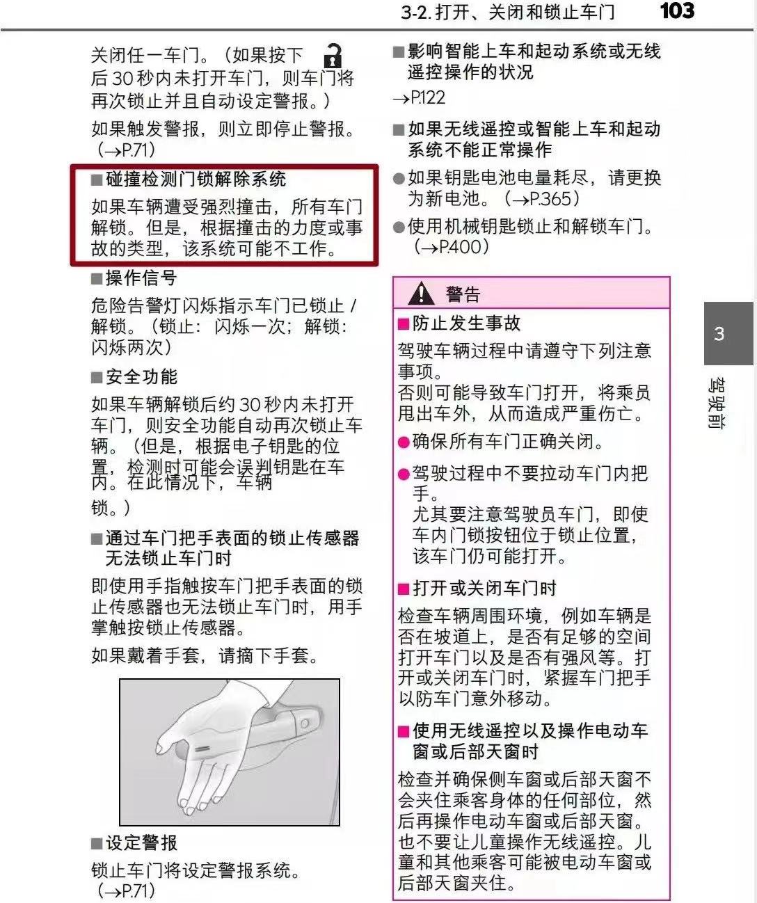 记者在雷克萨斯LM说明书第41页看到,在SRS空气囊展开(充气)的情况下,所有车门都将解锁。不过,在说明书103页“碰撞检测门锁解除系统”的说明中写到:“如果车辆遭受强烈撞击,所有车门解锁。但是,根据撞击的力度或事故的类型,该系统可能不工作。”
