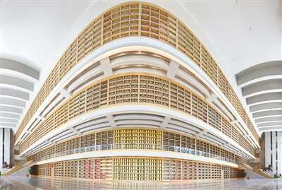 中国国家版本馆西安分馆文济阁巨型通顶书墙。本报记者 张丹华摄