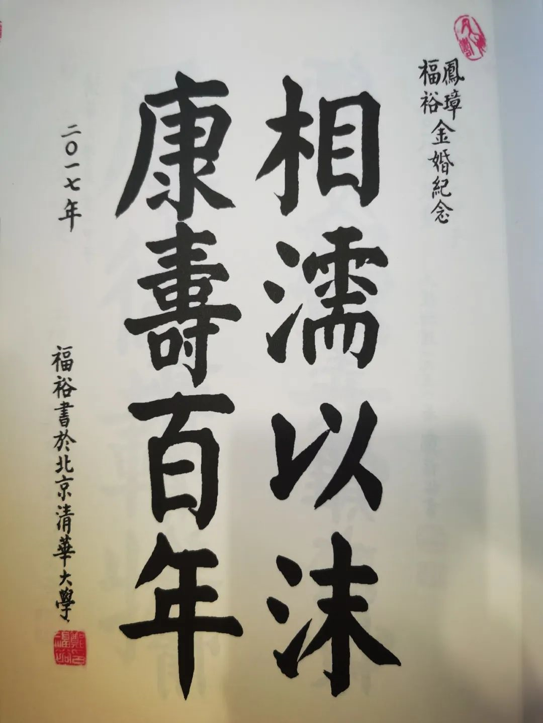 站在桌前铺平一张纸,从左至右细细打量,精心规划好一列要写什么、写多少字,方能蘸墨动笔。郑福裕不喜欢与熟人闲谈,偏爱独处,书法就是他和外界交流的那扇窗。他的恩师——已故的物理学大家、清华首位女教授王明贞,家里客厅的墙上挂着的就是郑福裕抄写的《枫桥夜泊》,选这首是因为“她是苏州人”。每年的结婚纪念日,郑福裕也为老伴王凤璋书写一幅作品,金婚纪念的那两句词,是“相濡以沫,康寿百年”。