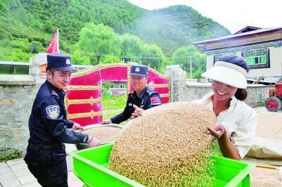 西藏移民管理警察帮助边境群众收青稞。伍俊丞摄/光明图片