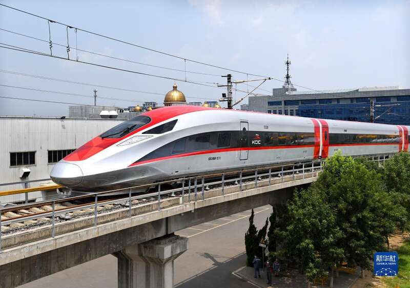 8月5日,一列雅万高铁高速动车组行驶在位于山东省青岛市的中车四方股份公司环形试验线上。