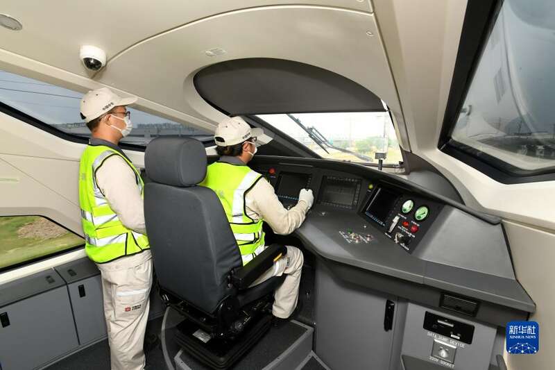 8月5日,工程人员驾驶雅万高铁高速动车组行驶在位于山东省青岛市的中车四方股份公司环形试验线上。