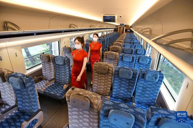 8月5日,在位于山东省青岛市的中车四方股份公司,礼仪人员从雅万高铁高速动车组车厢内部经过。