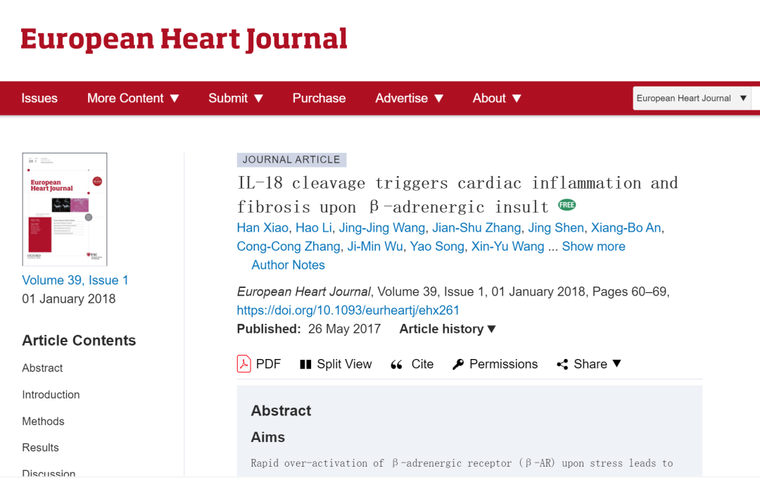 回国之后,肖晗在博士课题的基础上,展开了对药物二甲双胍减轻心脏纤维化机制的进一步研究,并探究了交感应激引发心脏特异性炎症损伤的机制及其干预手段。急性应激状态下,交感过度激活可促发和加重心血管疾病。在研究过程中,肖晗发现,交感应激后,心脏会快速产生并激活心肌炎症小体/IL-18,应激后尽早阻断IL-18活性可抑制心脏炎症及纤维化。因此,炎症小体/IL-18有望成为应激相关心血管疾病的新治疗靶点。