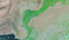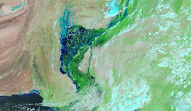 从NASA上月末公布的卫星图像可以看到,图像中心的一大片深蓝色区域代表着泛滥的洪水,淹没了大约100公里宽的区域,将曾经的农田变成了一个巨大的内陆湖。报道称,与去年同期相同区域的卫星图像相比,这是一个令人震惊的变化。在这片内陆湖的比照下,周围的河流及支流都显得窄小了许多,凸显出信德省受灾的严重程度。