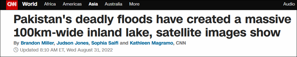 “世界末日”“前所未有”“季风就像打了兴奋剂”......对于巴基斯坦本轮造成逾千人死亡的洪涝灾害,外媒和当地官员竭力用各种词汇描述着它的严重性,而来自太空的卫星图像更直观地揭示出洪水中巴基斯坦惊人的变化。