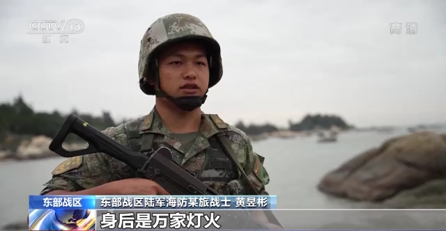 东部战区陆军海防某旅战士 黄昱彬:我们巡逻在祖国万里海疆,踏在蜿蜒曲折的海岸线上,身后是万家灯火,能为祖国站岗放哨,我感觉无限光荣与自豪。