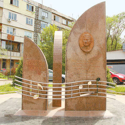 矗立在阿拉木图市“冼星海大道”路口的冼星海纪念碑。本报记者 曲 颂摄