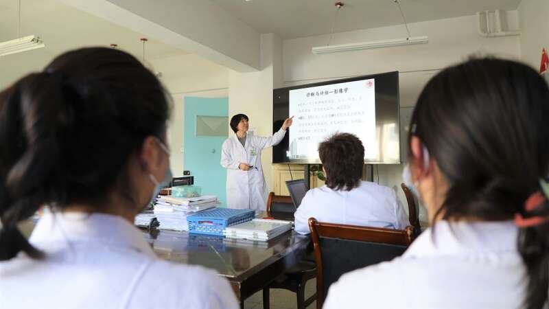 天津市中心妇产科医院妇产专业副主任医师饶阳给甘南州人民医院妇产科的医生进行培训(2021年1月15日摄)。新华社记者 张睿 摄