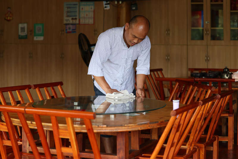 在湖南省湘西土家族苗族自治州十八洞村,杨正邦在自家农家乐打扫卫生(2022年7月2日摄)。新华社记者 薛宇舸 摄
