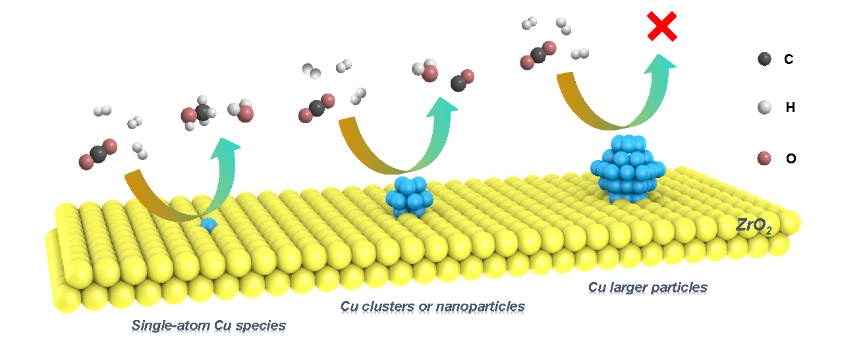 该研究工作针对传统铜基甲醇合成催化剂中活性位点复杂,构效关系模糊的难题,设计制备出低温稳定的单原子铜基催化剂(Cu1/无定型ZrO2),其清晰的活性位点结构以及单一的产物分布清楚地揭示了催化剂结构与性能间的关系。