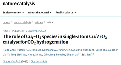 近日,福州大学化学学院谭理课题组与复旦大学刘智攀课题组合作在单原子催化剂用于二氧化碳热催化合成甲醇领域取得突破性进展,相关研究成果以“The role of Cu1–O3 species in single-atom Cu/ZrO2 catalyst for CO2 hydrogenation”为题发表在催化学科国际顶级期刊Nature Catalysis (DOI:10.1038/s41929-022-00840-0)。文章第一作者为福州大学化学学院在读博士生赵慧博,通讯作者为谭理副教授及复旦大学刘智攀教授,福州大学为第一通讯单位。