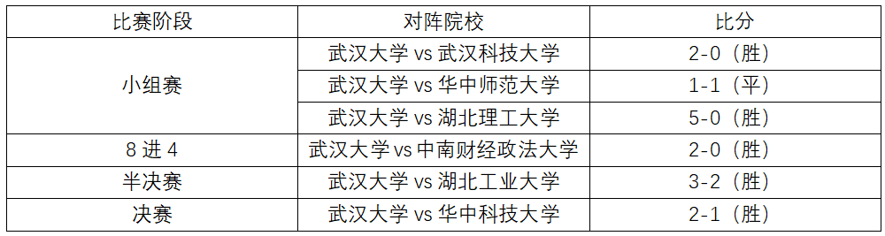 比起小组赛,与华中科技大学的决赛是挡在冠军面前的一堵墙。华科大是湖北省的传统强队,在决赛前一球未丢,实力强劲。决赛第30分钟,华科大就率先拿下一城。武大队员们并未因此冒进,而是继续保持节奏借机进攻,仅仅5分钟后,11号李轲再次借助点球机会,迅速扳平比分。