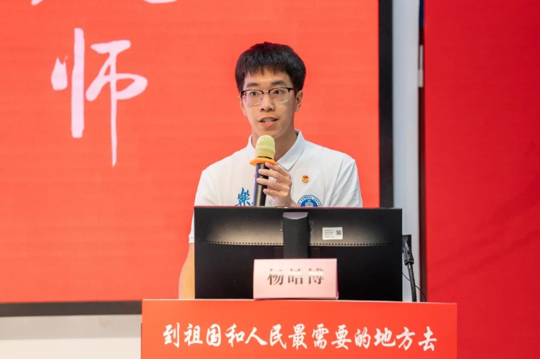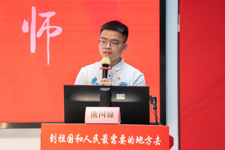 “优师计划”师范生代表熊国锦同学以“我的起点,亦是终点”为题进行发言。他表达了作为一名北师大培养的定向就业师范生,将以坚定的从教信念,到祖国和人民最需要的地方去建功立业的决心;在大学求学生活中,将追风赶月,笃行不怠,以严谨笃学的态度不断充实和提高自己,以期将来回到家乡,扎根大山教学一线的时候,能成为学生喜欢的“四有”好老师。