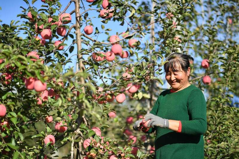 2022年10月10日,果农在延安市洛川县阿寺村一处果园采摘苹果。新华社记者 张博文 摄