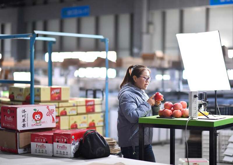 2022年10月10日,洛川县一家果品企业的工作人员在仓库进行线上直播。新华社记者 张博文 摄