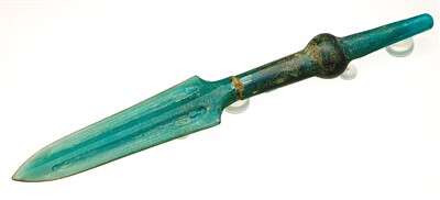 来自湖南博物院的西汉玻璃矛是本次展览的明星展品之一。玻璃矛为绿色半透明状,长18.8厘米,刃宽2.2厘米,矛脊两侧有槽,矛柄作圆柱状,柄中部凸起成圆球形。这种兵器造型的玻璃制品非常罕见,专家推测其为礼器或明器。这件玻璃矛是本土工匠在吸收地中海玻璃制造技术的基础上制作而成,反映了西汉玻璃工艺的高超水平,是研究玻璃文化传播的重要实物资料。
