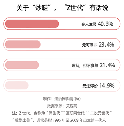 从艾媒网发布的数据来看,40.3%的“Z世代”(通常是指1995年至2009年伴随着互联网出生的一代人)厌恶“炒鞋”这一行为,23.4%的“Z世代”则认为“炒鞋”无可厚非。