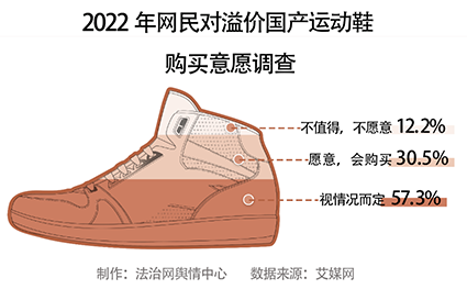 从艾媒网公布的数据来看,30.5%的消费者表示,无论国产运动鞋溢价多少都愿意购买,57.3%的消费者称会视溢价情况而定,12.2%的消费者表示不会购买国产溢价运动鞋。