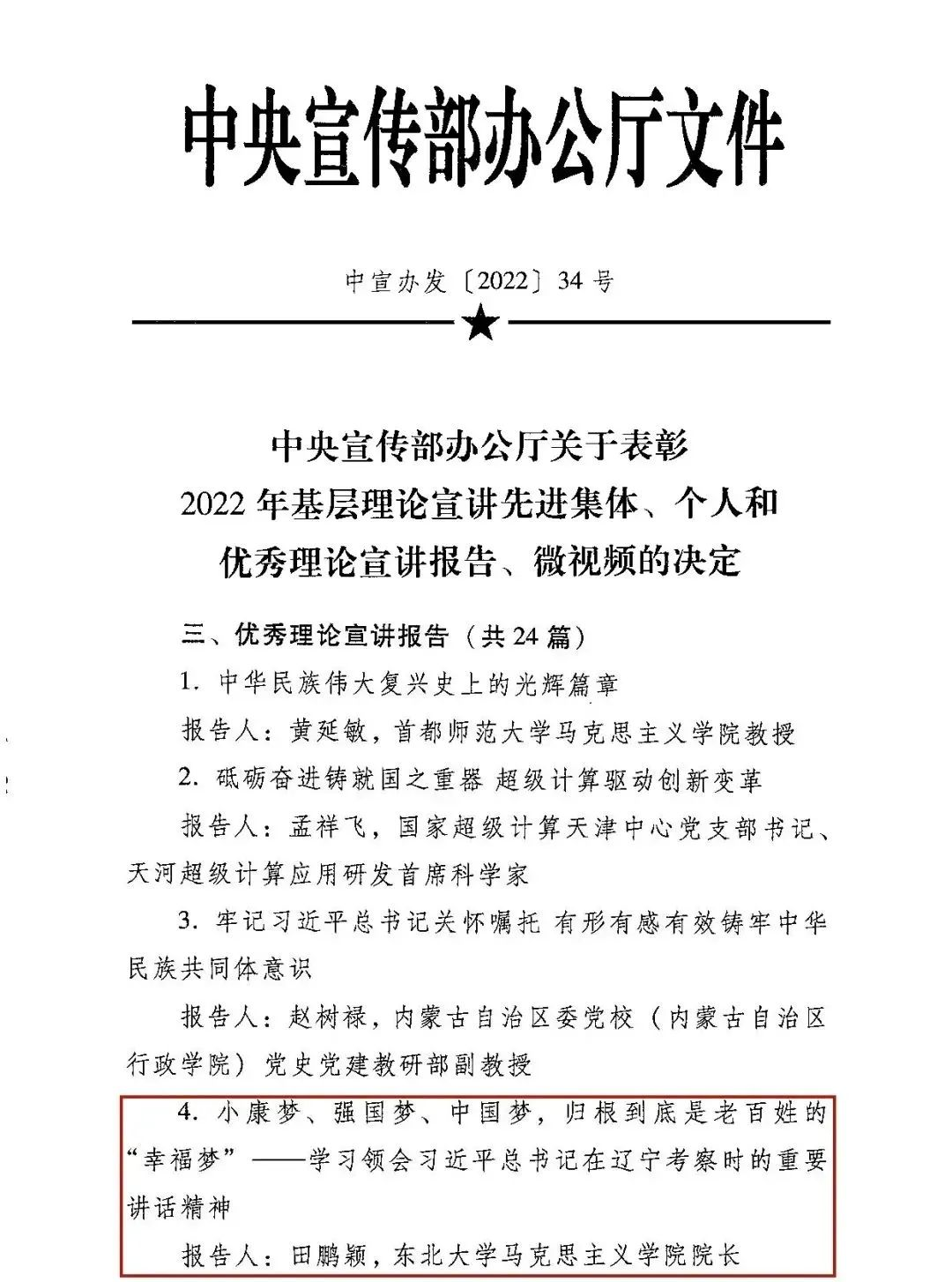 10月20日,中央宣传部办公厅公布了《关于表彰2022年基层理论宣讲先进集体、个人和优秀理论宣讲报告、微视频的决定》,东北大学马克思主义学院院长田鹏颖教授所作的 《小康梦、强国梦、中国梦,归根到底是老百姓的“幸福梦”——学习领会习近平总书记在辽宁考察时的重要讲话精神》 报告成功入选“优秀理论宣讲报告”。