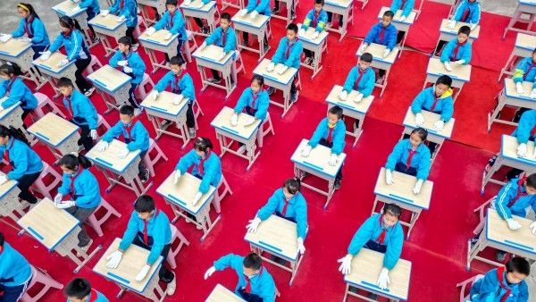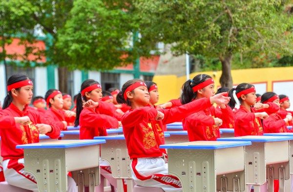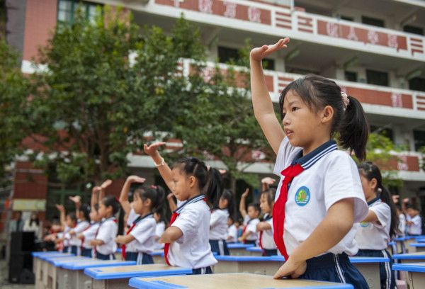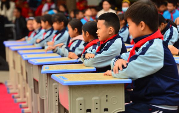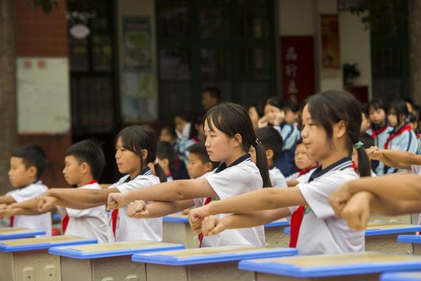 2022年11月18日,贵州黔东南从江县,小学生们在参加“课桌舞”表演。为进一步落实国家“双减”政策,丰富学生的校园生活,提升班集体凝聚力,促进学生全面发展。11月18日,从江县城关第三小学举办以“登峰少年心向党 阳光活力满校园”为主题的“课桌舞”比赛。