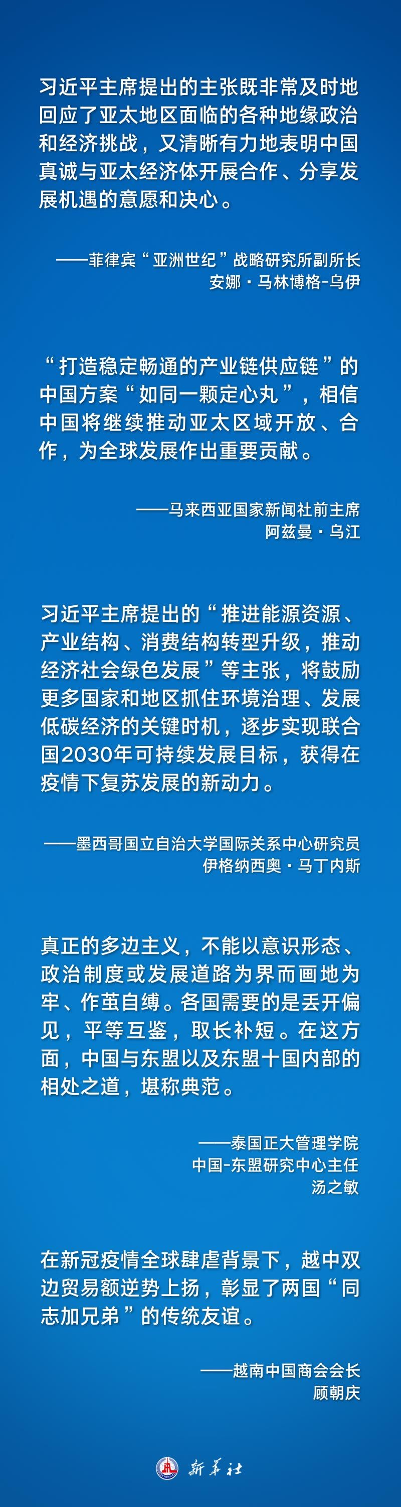 习近平主席的系列重要讲话在国际社会引发热烈反响。多国人士认为,习近平主席全面总结了“亚太奇迹”的经验与启示,就携手构建亚太命运共同体提出重要主张,深刻阐释了中国式现代化的机遇与贡献,为再创亚太合作新辉煌注入强劲动力。