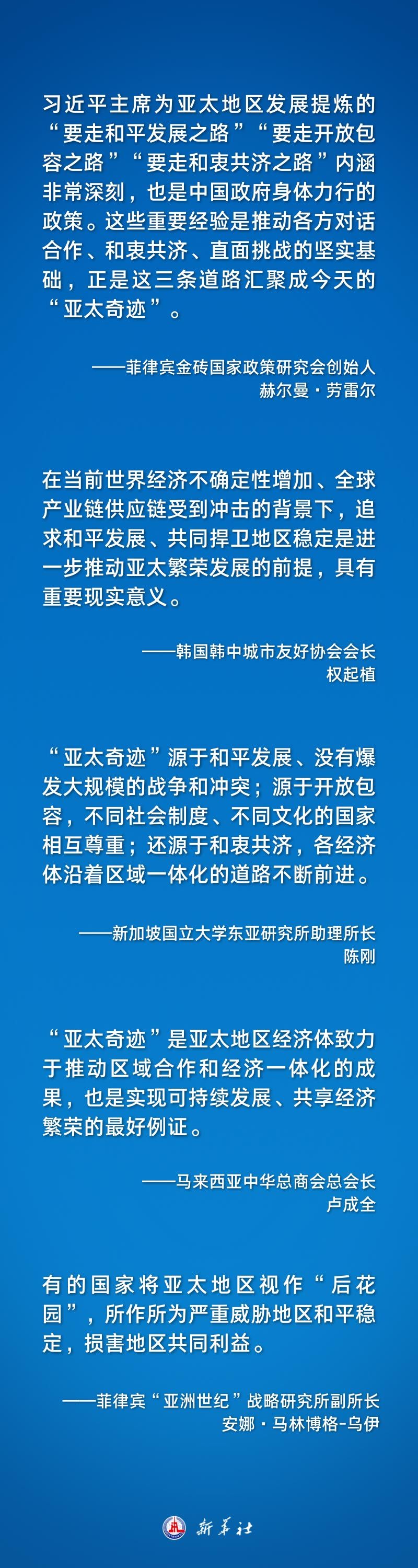 习近平主席在总结亚太合作的历史经验时指出:“亚太奇迹”是靠大家携手奋斗、爬坡过坎创造的。亚太过去几十年经济快速增长,得益于和平稳定的环境。历史反复证明,开放包容、合作共赢才是人间正道。