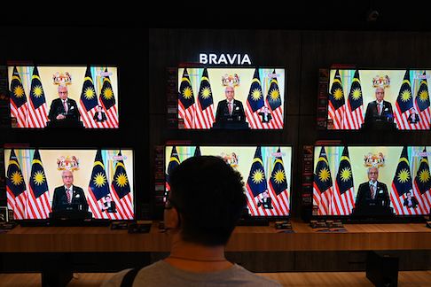 当地时间2022年10月10日,一名男子在马来西亚吉隆坡一家电器店观看马来西亚总理伊斯迈尔电视讲话直播。新华社记者 朱炜 摄