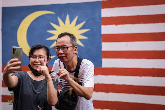 当地时间2022年11月19日,马来西亚吉隆坡,选民在投票站投票后举着涂了墨水的手指自拍。视觉中国 图