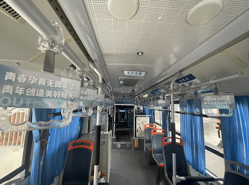 例如,在车头及外部中门下客处前侧腰牌处设置“青年公交专线”字样,在车辆前挡风玻璃左上方设置“青年公交专线”标识,在驾驶员隔离防护设施外部下方设置青年元素的宣传画,在车厢内吊环拉手、车厢上方、乘客座椅背部、车厢尾部两侧等处设置青年主题相关漫画及标语,修改车载语音播报系统,乘客上车时播报“欢迎乘坐泰兴青年公交专线,青春泰兴有你更青春”。