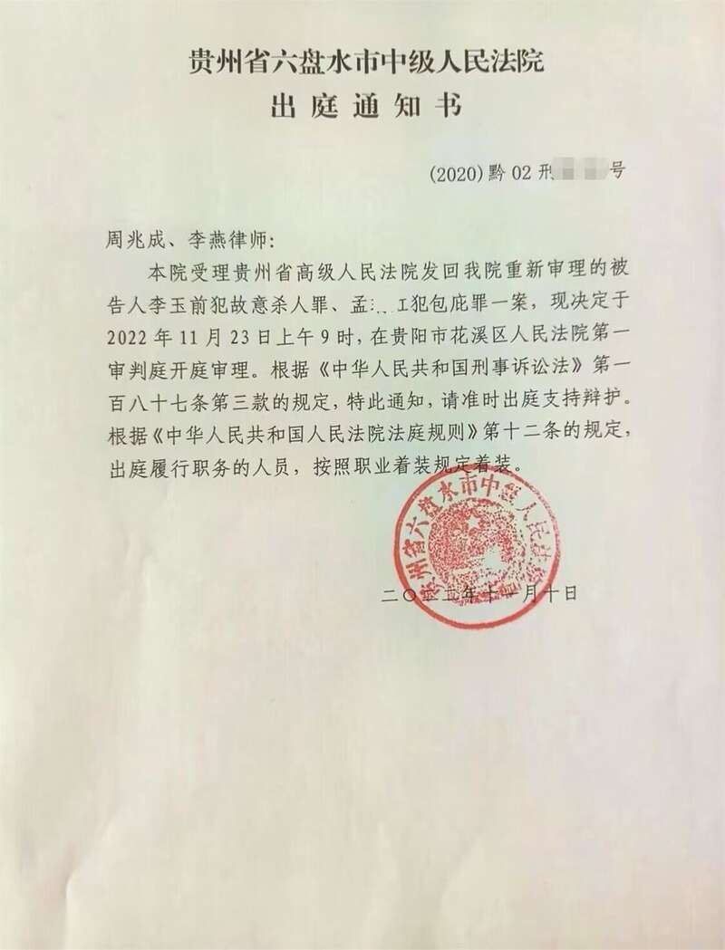 李玉前说,此次重审中,六盘水市中院找到了此前“下落不明”的原审被告人孟某红,并再次将她通知到庭。孟某红也参加了11月23日、24日的庭审。