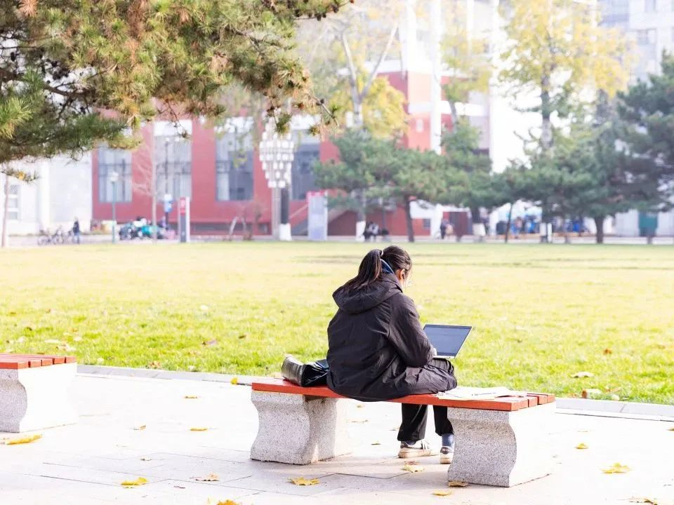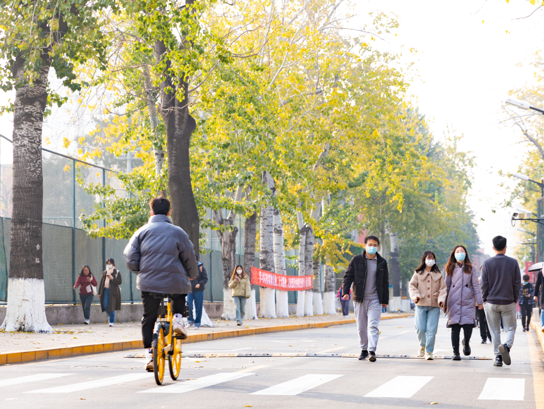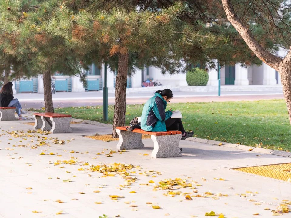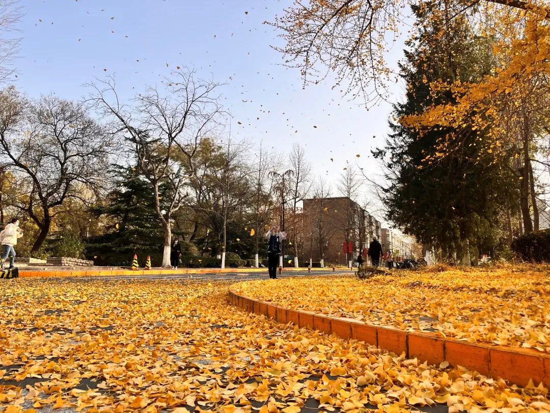 去图书馆借书的路上,初冬的气息扑面而来,有同学在银杏林中与金黄的“地毯”合影,他们的笑脸也点缀了校园的色彩。