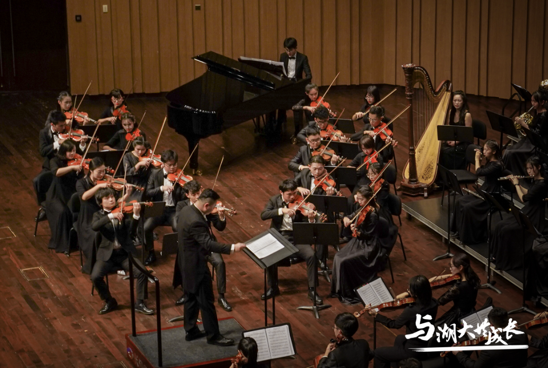这几年,乐团在湖南音乐厅、长沙音乐厅、学校大礼堂都留下过演出的足迹,在辞旧迎新之时、建党100周年之际都留下过激昂的乐音。很荣幸能见证乐团的成长,更加感恩乐团在“万卷古今消永日,一窗昏晓送流年”的科研工作中带给我的来自音乐的宁静与激情。