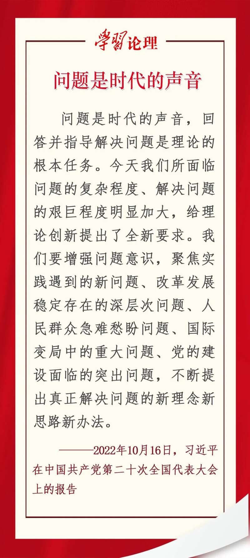 问题是时代的声音。习近平总书记指出:“每个时代总有属于它自己的问题,只要科学地认识、准确地把握、正确地解决这些问题,就能够把我们的社会不断推向前进。”党的二十大报告鲜明指出:“问题是时代的声音,回答并指导解决问题是理论的根本任务。”
