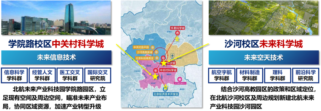 加快北航“双一流”建 设,依托北航学院路和沙河校区、国家级重点实验室、国家 级工程研究中心、北京市高精尖创新中心,培育一批顶尖研 究型人才、复合创新型人才,开展有组织科研和有组织科技 成果转化,突破一批引领性原创成果,争当未来空天科技创 新领跑者。