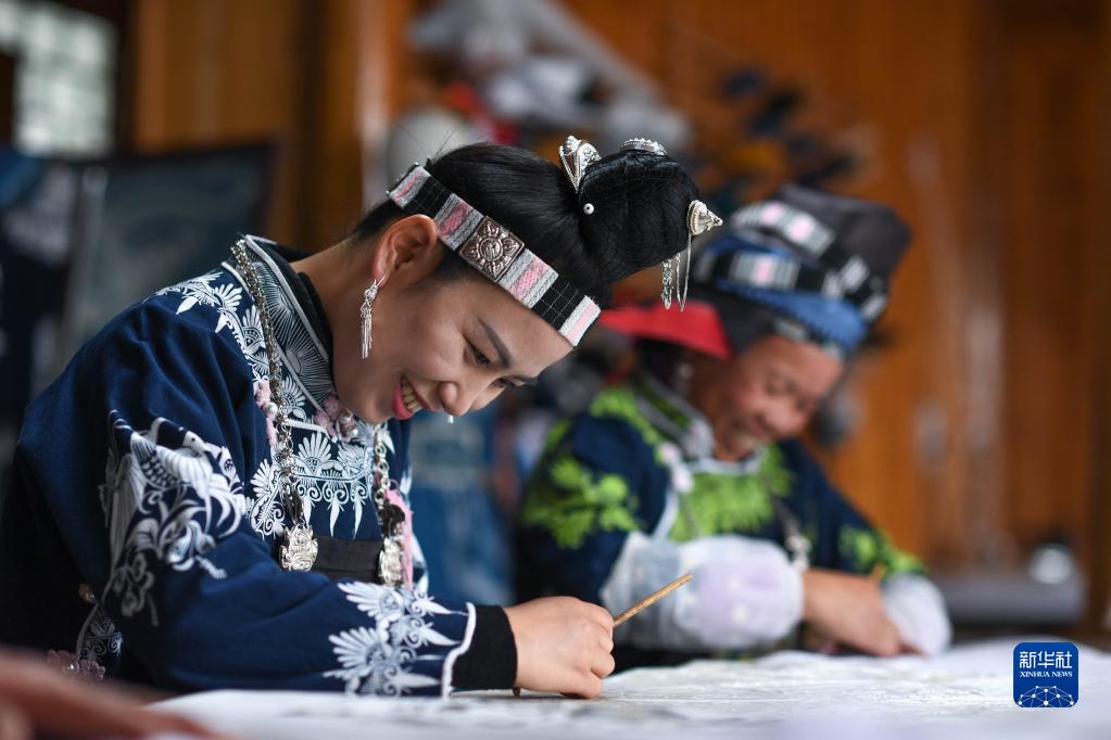 29岁的张义苹是一名蜡染技艺非遗传承人,带动当地数十名妇女从事蜡染制作。“我们主要生产、销售蜡染产品,入驻‘银匠村’半年来,我为更多学生和游客传授蜡染技艺,让更多人了解这项非物质文化遗产,也拓展了增收渠道。”她说。