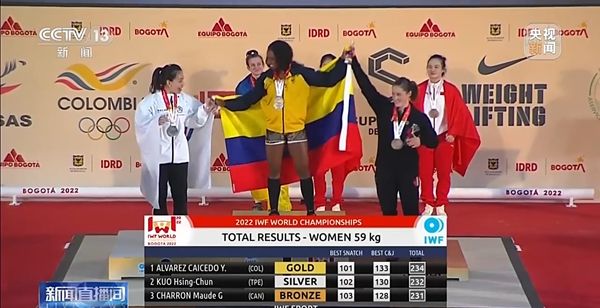 冠军是本土作战的哥伦比亚老将阿尔瓦雷兹,她今天三次挺举试举全部成功,最终以133和234公斤,将挺举和总成绩两枚金牌同时揽入怀中。