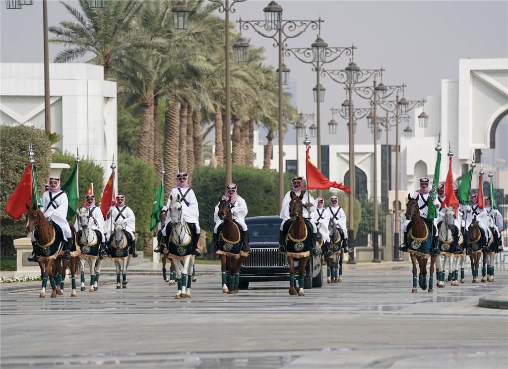 沙特王宫摩托车队和马队护卫习近平专车抵达,沙特王储兼首相穆罕默德在下车处热情迎接,习近平在穆罕默德王储陪同下检阅王宫仪仗队,沙特王宫卫队以传统执剑礼仪向习近平表示最隆重欢迎。