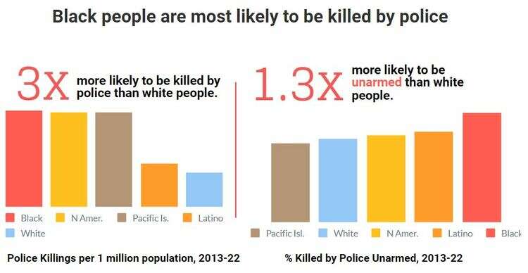 非洲裔被警察杀死的概率是白人的3倍,在手无寸铁情况下被警察杀死的概率是白人的1.3倍。