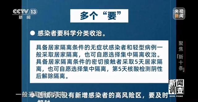 “新十条”中,首次正式明确提出具备居家隔离条件的无症状感染者和轻型病例一般采取居家隔离,也可自愿选择集中隔离收治。同时对具备居家隔离条件的密切接触者采取5天居家隔离,也可自愿选择集中隔离,第5天核酸检测阴性后解除隔离。