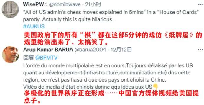 近日,新华社网红工作室戏仿曾红极一时的美剧《纸牌屋》制作英文微电影《扯牌屋·谁最心机》,在海内外引发热烈反响,众多官员、学者、媒体人下场互动。其中,一些来自美国的反应尤为显眼。对此,用一个网友的话来形容:一些美国人真坐不住了!