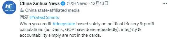 对此,新华社模仿其口吻回应:“当你通过政治把戏和利益算计为‘深层国家’正名助力(正如美国两党一贯做的那样)时,你就谈不上正直和问责。”并追问他:“您是怎样读《人民日报》的呢?需要借助谷歌翻译不?”