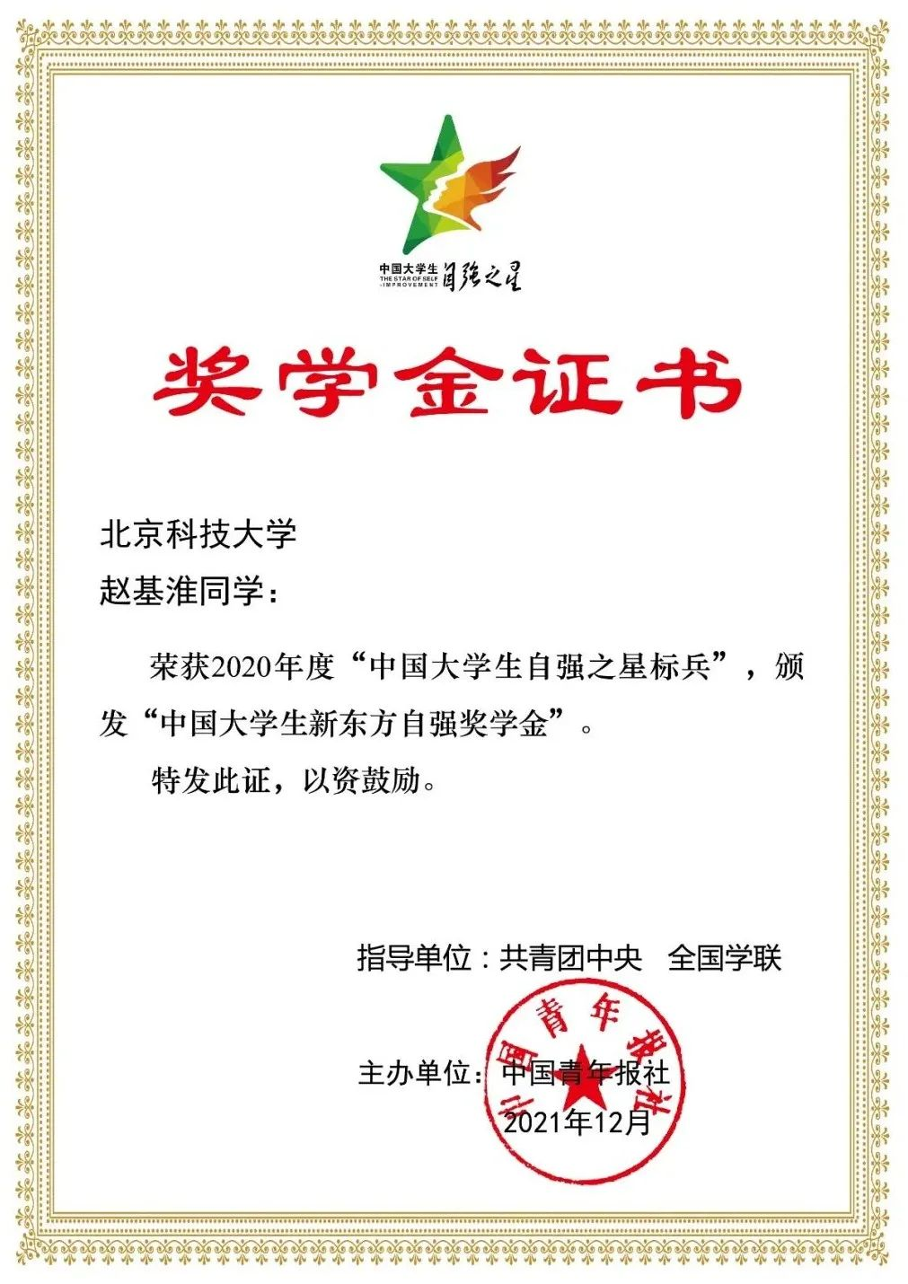 2021年12月21日,2020年度“中国大学生自强之星”奖学金获得者名单正式揭晓,经基层选拔、学校推荐、省级初评、全国评审等环节,赵基淮获得“中国大学生自强之星标兵”奖学金(全国共10位),成为北京地区唯一获此称号的大学生。