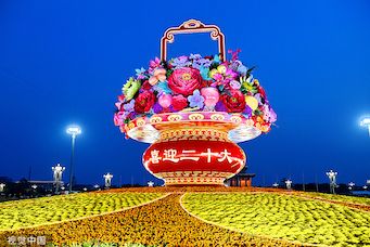 2022年9月28日晚,北京天安门广场中心花坛“祝福祖国”巨型花果篮在灯光照射下流光溢彩。视觉中国 资料图