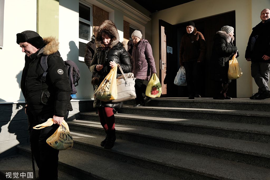 当地时间2023年1月07日,乌克兰哈尔科夫,人们在教堂服务后收到几袋食物。视觉中国 图