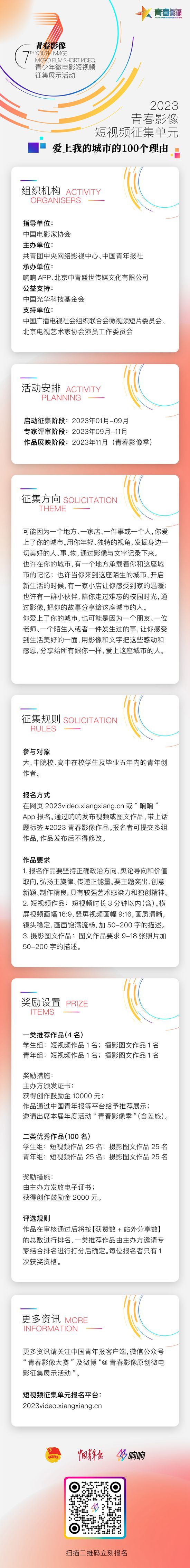 2022年12月31日,在中国电影家协会的指导下,由共青团中央网络影视中心、中国青年报社、珠海奇妙科技有限公司等单位组织开展的第七届青春影像——“爱上我的城市的100个理由”短视频征集单元正式启动!