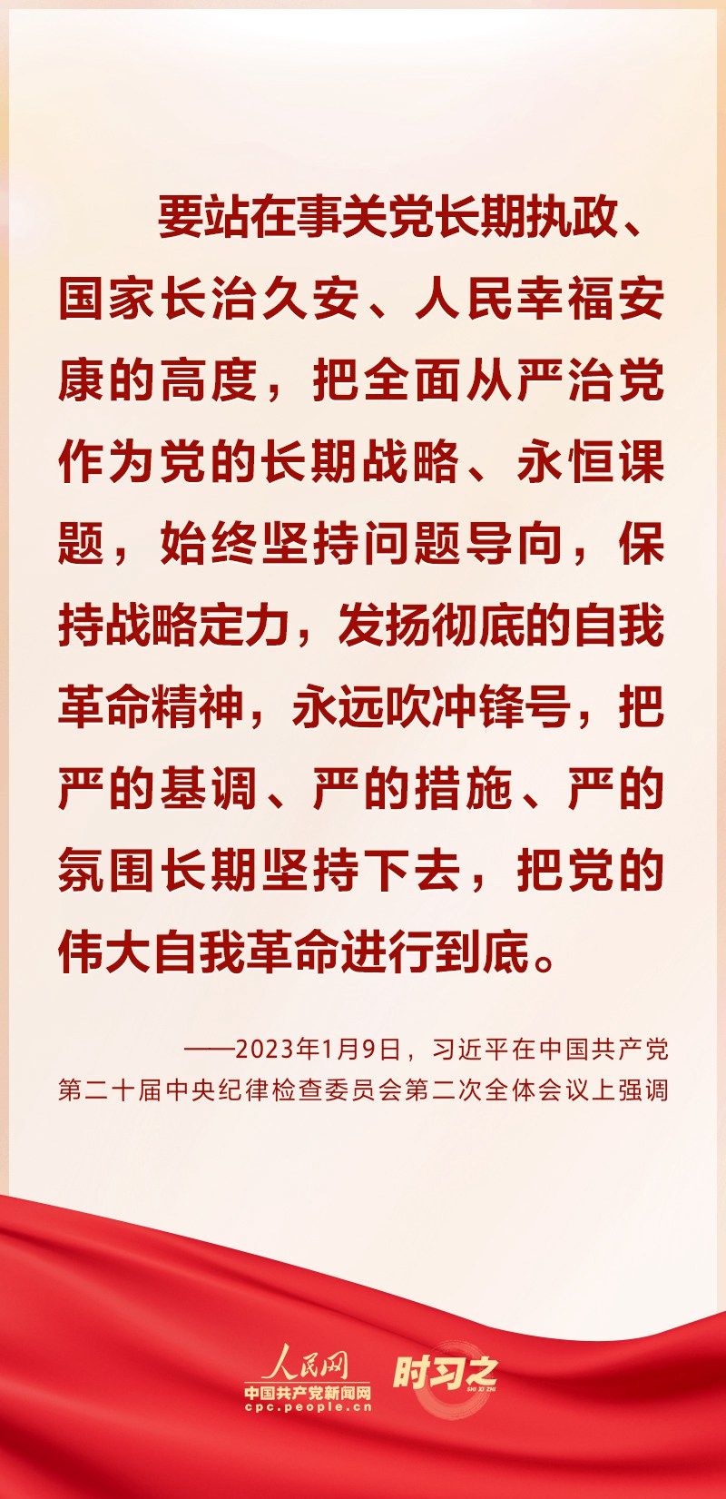 2023年1月9日上午,中共中央总书记、国家主席、中央军委主席习近平在中国共产党第二十届中央纪律检查委员会第二次全体会议上发表重要讲话。习近平在讲话中强调要“发扬彻底的自我革命精神”“把党的伟大自我革命进行到底”。一直以来,习近平多次在重要场合对“自我革命”这个重要课题进行深入阐释,一起学习领悟。
