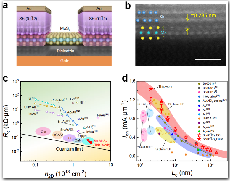 2)-MoS2接触中实现了42 Ω·μm的超低接触电阻,刷新了金属-半导体接触电阻的最低纪录,已逼近理论量子极限。该接触在125°C的工作温度下具有良好的稳定性。